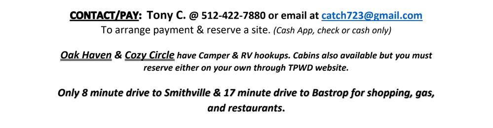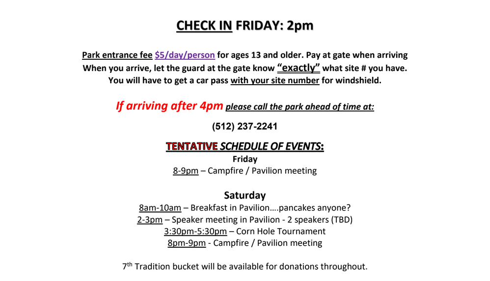 CTANA 13th Annual Campout December 28, 2022 Stephanie Calendar Add to Calendar Add to Timely Calendar Add to Google Add to Outlook Add to Apple Calendar Add to other calendar Export to XML When: April 4, 2025 – April 6, 2025 all-day 2025-04-04T00:00:00-05:00 2025-04-07T00:00:00-05:00 Where: Beuscher State Park - Lakeview Camping Area 100 Park Rd 1C Smithville, TX 78957 USA Cost: 30.00 Contact: Tony C. 512-422-7880 Email Events Join us for the 13th annual CTANA Campout at Beuscher State Park! Friday, April 4th through Sunday, April 6th, 2025. Cost is $30 for both nights (tent or vehicle camping only). Contact Tony C. at 512-422-7880 or by email at catch723@gmail.com to arrange payment and reserve a site. Details can be downloaded in this flyer or viewed below:
